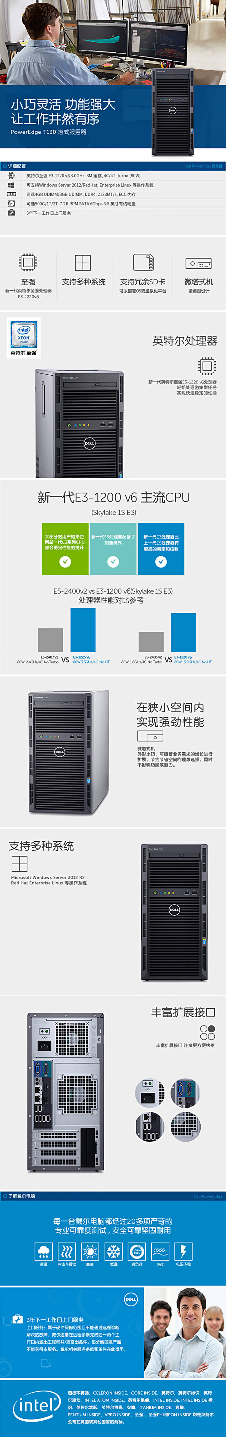 戴尔 DELL T130 塔式服务器(E3-1220V6/8G/1TSATA企业级/DVD/29